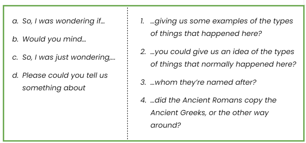 3. Listen to 3 visitors asking a tour guide questions about the Roman Forum. Do they ask any of your questions from exercise 1? There will be a pause between each speaker.