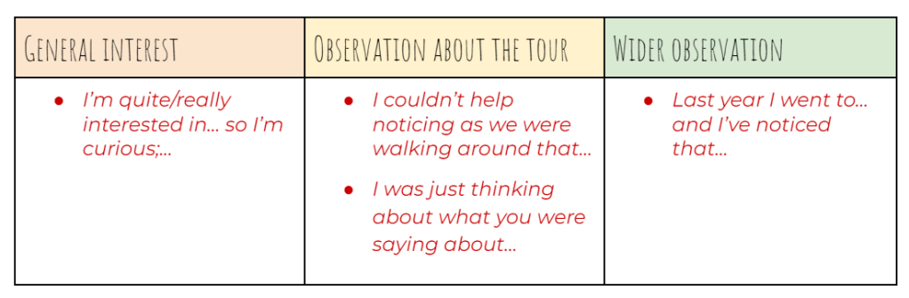 Receiving questions from members of your tour group can be challenging because you have to understand the question and think of a reply in English there and then. However, despite these challenges, it’s a useful skill to develop. Not only does it help your group to feel involved in the tour, it also allows them to explore their curiosities, which you might only have touched on in your talk. In this lesson you will practise listening to questions from members of your tour group and the reasons behind them, so that you are ready to respond when you ask your group…