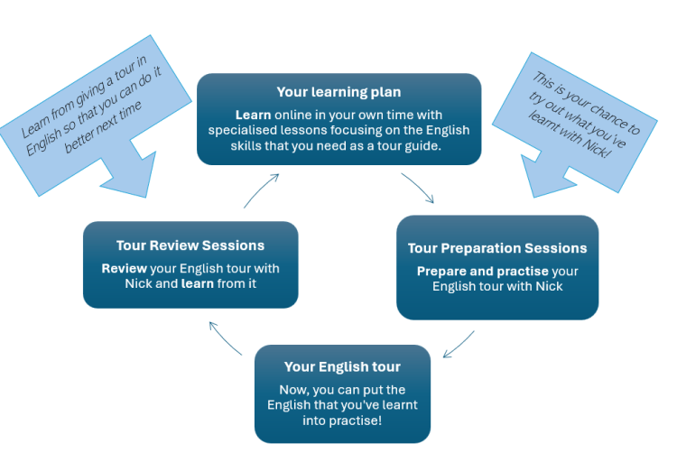 I know you’re busy, so Guide better tours in English fits into your working week by combining supported learning in your own time with 1-to-1 sessions with me to prepare your English tours and learn from them afterwards.