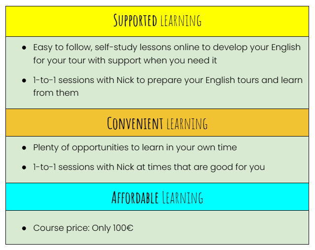 1-to-1 support and a personal learning plan to help you to give your best tour in English!