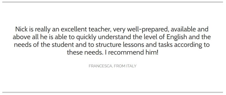 I’d be very pleased to talk to you about your English and to make some suggestions about how to improve it based on my teaching experience. If you’d like to have a chat with me, click on the link below and make an appointment for a time that’s good for you. It’s completely free!